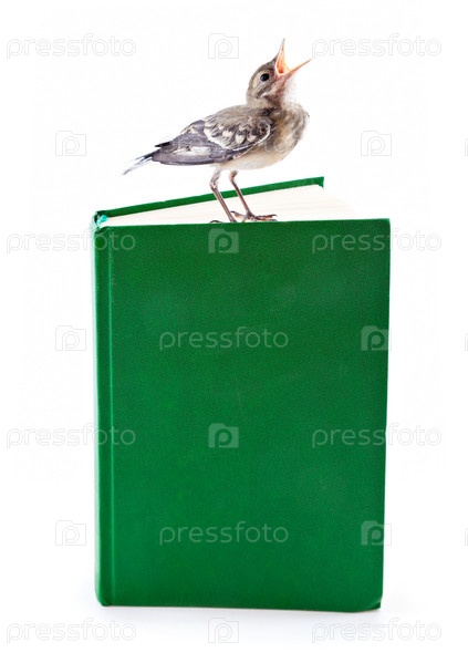Трясогузка на книге на белом фоне