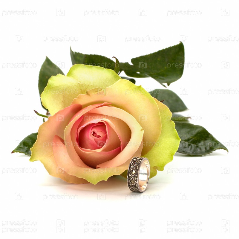 Красивая роза и обручальное кольцо, изолированные на белом фоне