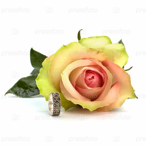 Красивая роза с обручальным кольцом на белом фоне