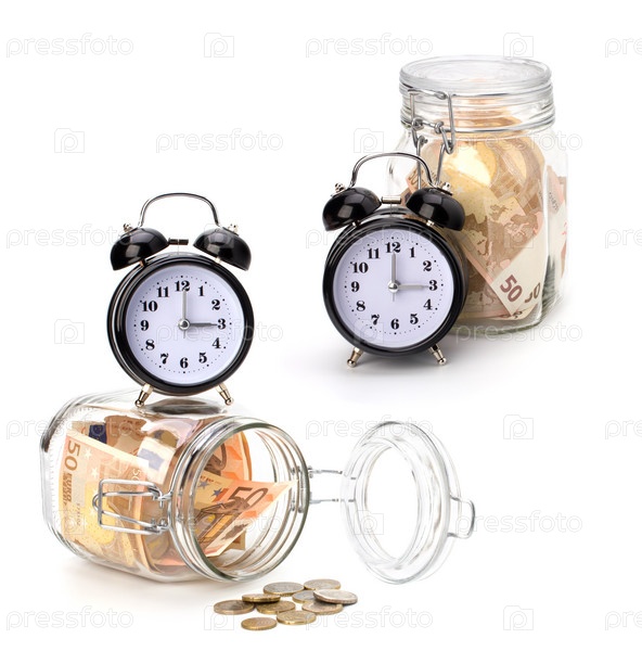 Концепция накопления денег. Деньги и будильник на белом фоне