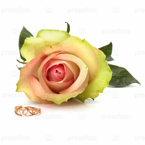 Красивая роза с обручальным кольцом на белом фоне