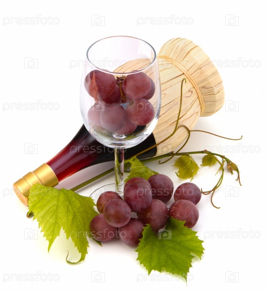 Бутылка красного вина и бокал с виноградом