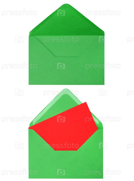 Зеленый конверт с открыткой на белом фоне