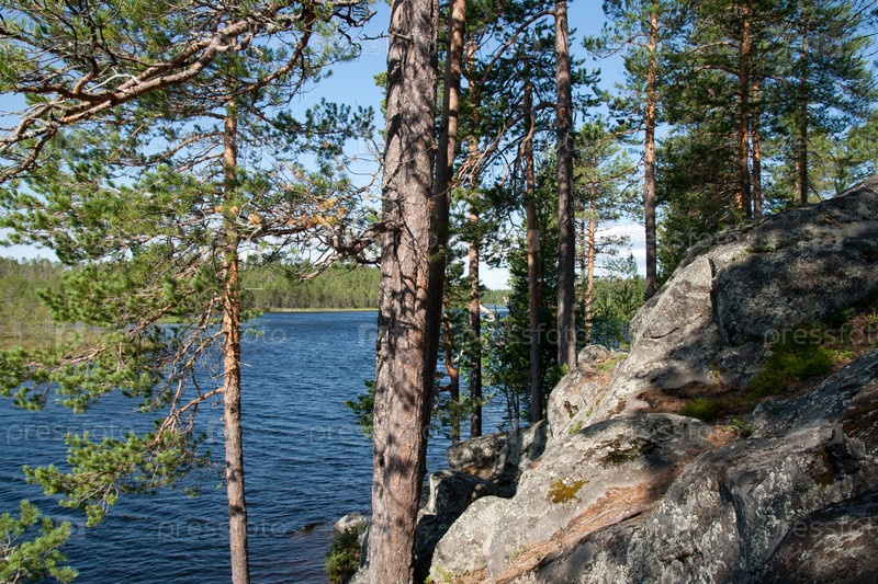 Каменистый берег озера с сосновыми деревьями
