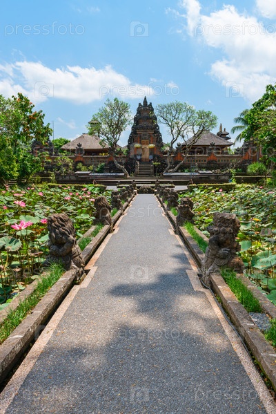 Балийский храм Пура Сарасвати с цветами лотоса на пруду