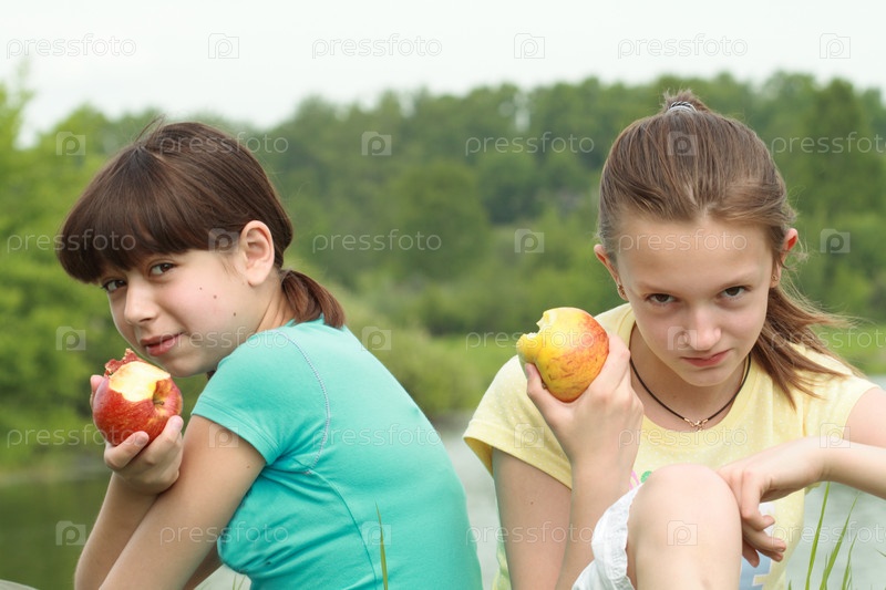 Две молодые девушки едят яблоки на фоне природы