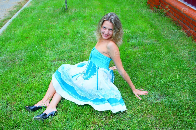 Молодая девушка в платье на газоне