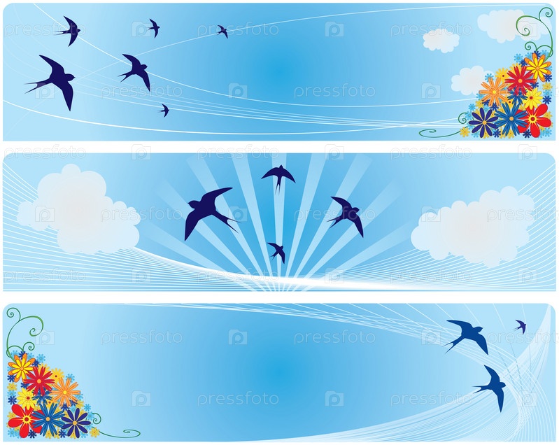 Изображение цветов и летящих ласточек на фоне голубого неба