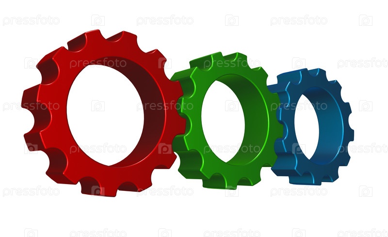 Зубчатые колеса в гамме rgb на белом фоне. 3d иллюстрация