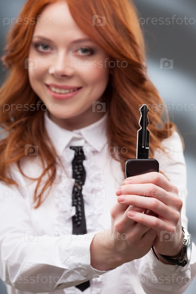 Счастливая женщина держит большой ключ