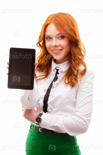 Рыжая женщина с цифровым планшетом