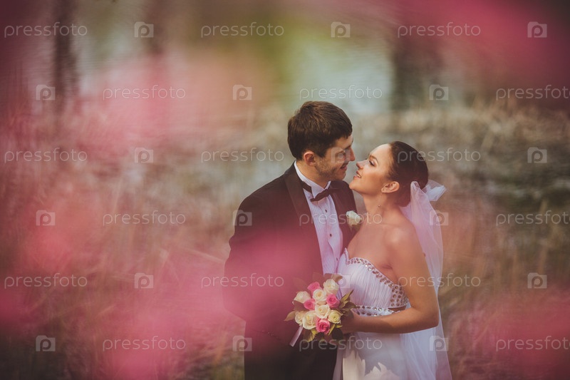 Счастливые молодожены в парке