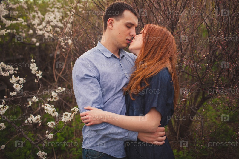 Пара целуется среди цветущих деревьев