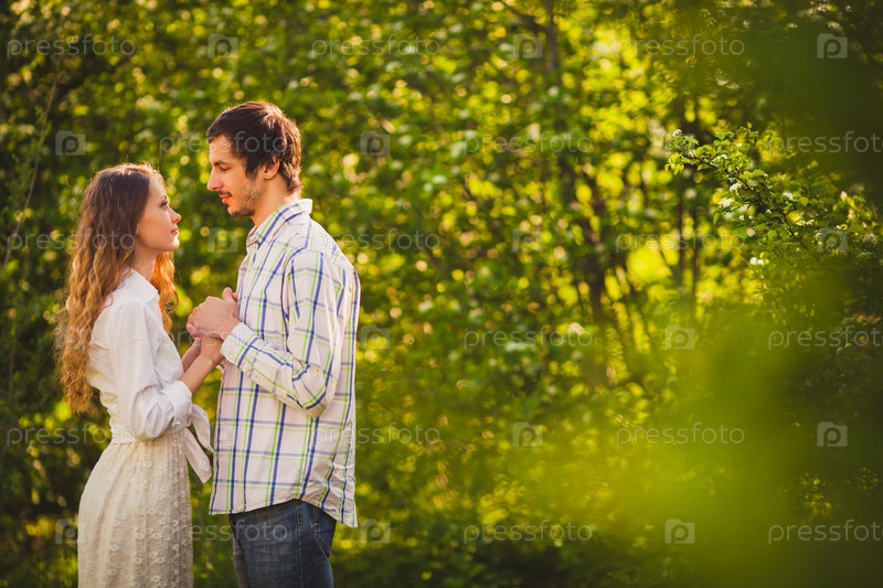 Влюбленные стоят в летнем парке