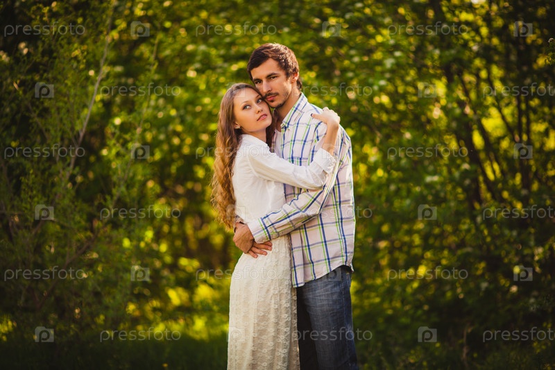 Влюбленные стоят в летнем парке