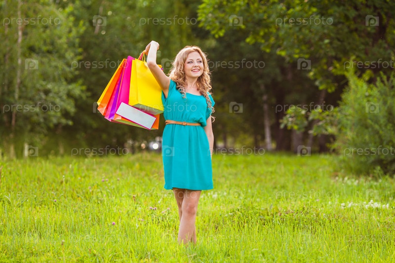 Счастливая женщина в парке с пакетами для покупок