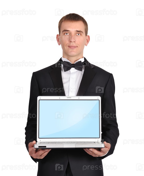 Мужчина держит ноутбук