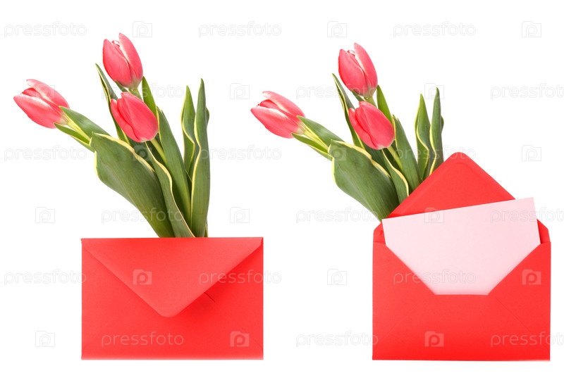 Открытка с розовыми тюльпанами, изолированная на белом фоне