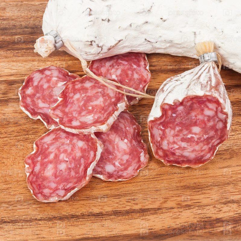 Колбаса салями на деревянном фоне