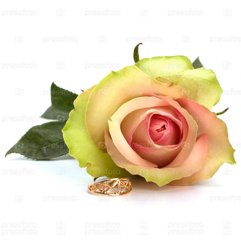 Красивая роза и обручальное кольцо, изолированные на белом фоне