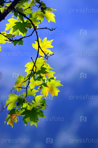 Ветка кленовых листьев на фоне синего неба