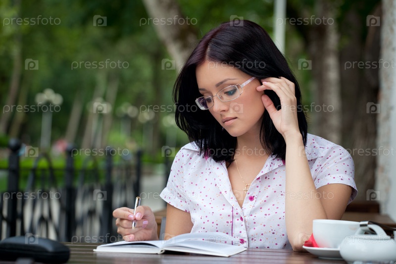 Девушка в очках, делающая записи