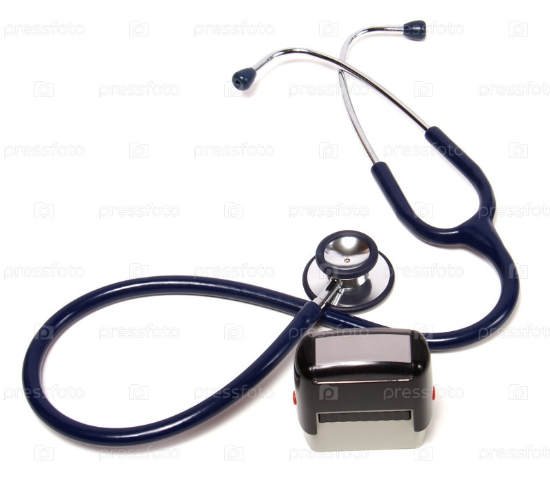 Стетоскоп и врачебный штамп, изолированные на белом фоне