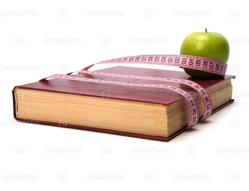 Сантиметровая лента, обернутая вокруг книги на белом фоне