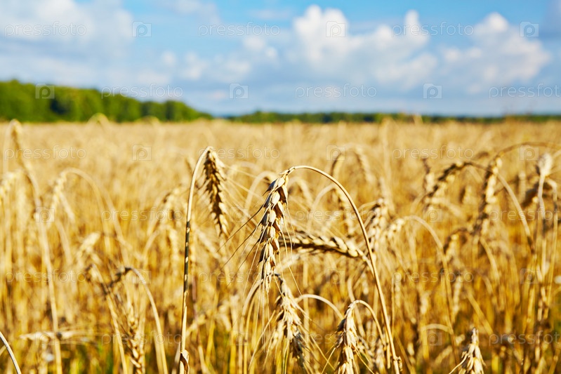 Золотая пшеница в поле, лес и голубое небо. Выборочный фокус