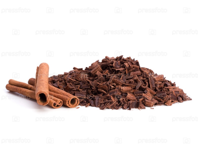 Тертый шоколад и корица на белом фоне