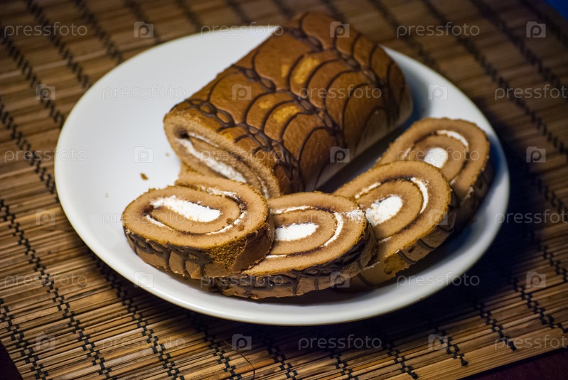 Нарезанный рулет с ягодами на тарелке