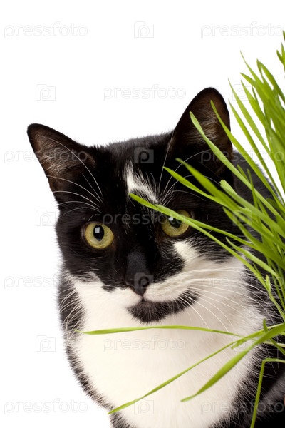 Кошка в траве, изолированная на белом фоне