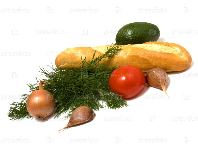 Овощи и хлеб, изолированные на белом фоне