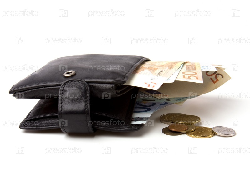 Деньги в кожаном кошельке, изолированные на белом фоне