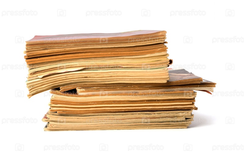 Стопка потрепанных журналов, изолированная на белом фоне