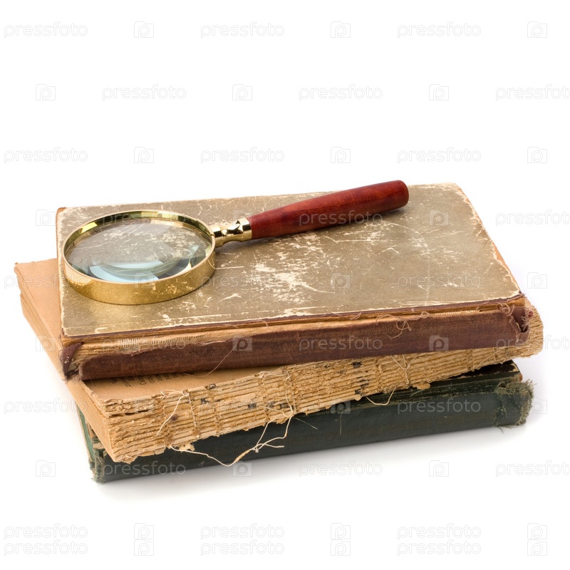 Оборванная книга и лупа на белом фоне