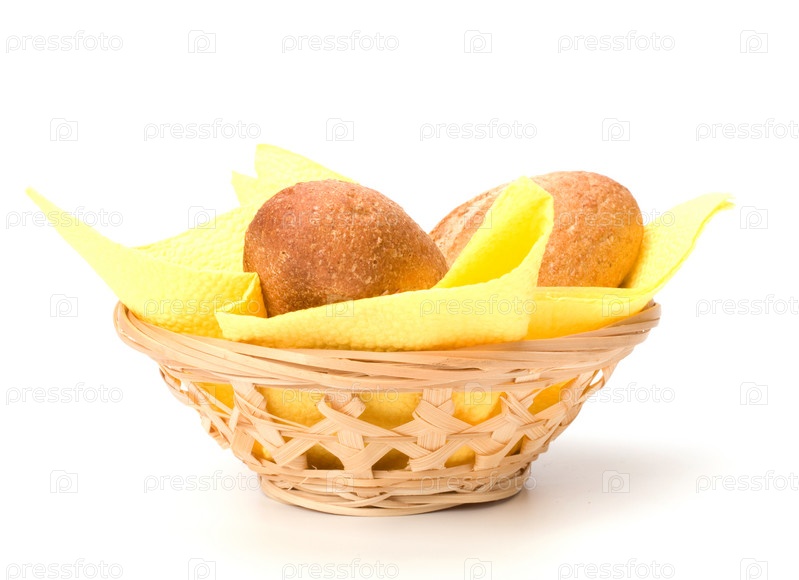 Свежие теплые булочки в хлебнице, изолировано на белом фоне