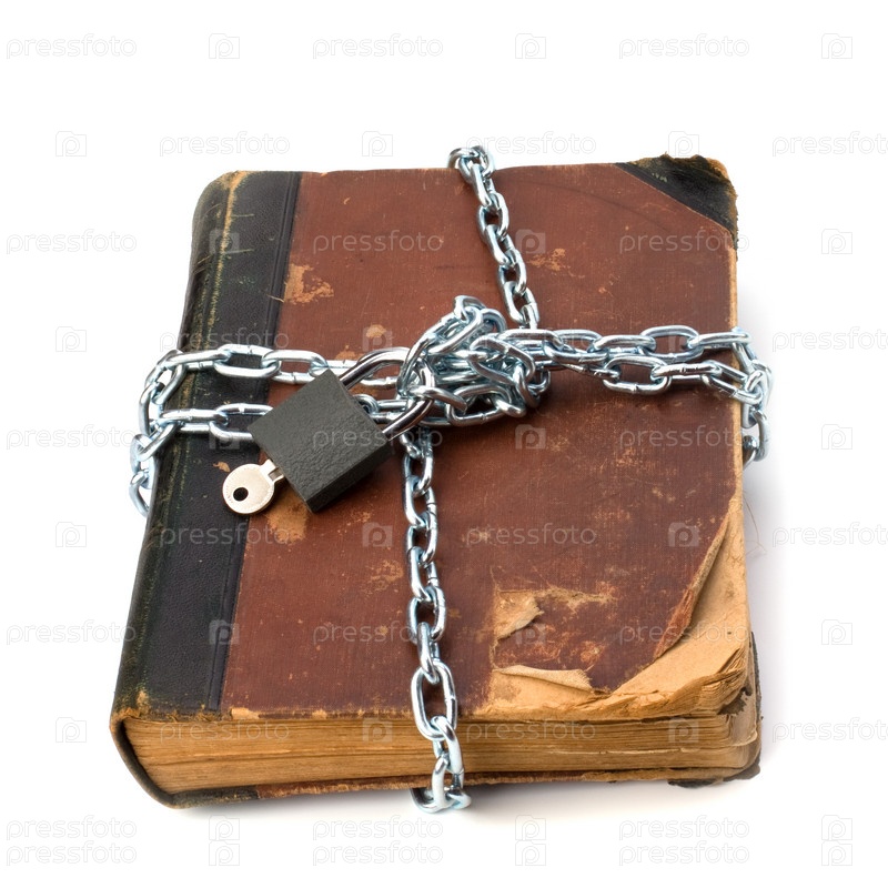Потрепаннаякнига с цепью и замком, изолированные на белом фоне