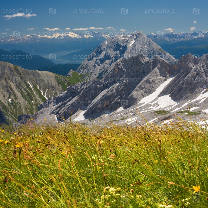 Поле цветов в Альпах на фоне гор. Баварские Альпы
