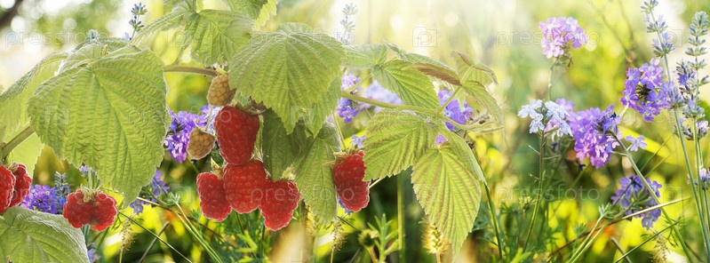 Спелая малина в летней закатной луговой траве