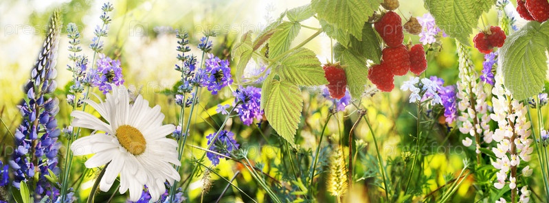 Спелая малина в летней закатной луговой траве