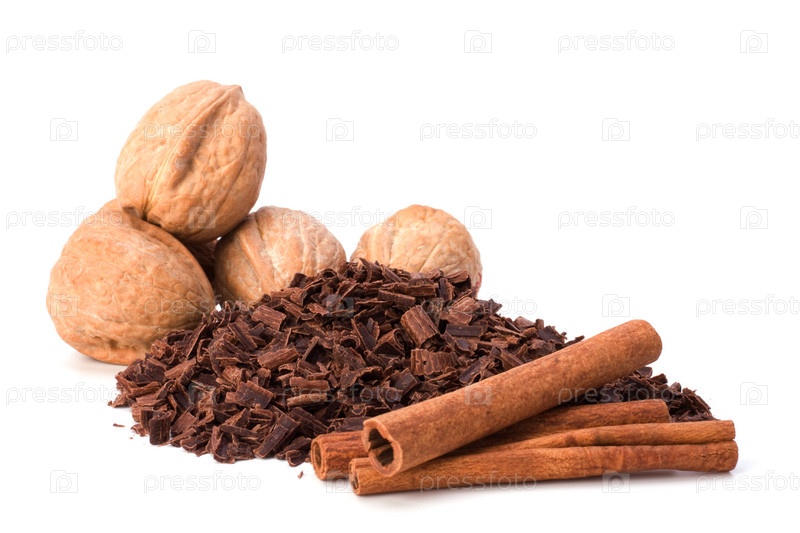 Тертый шоколад и орехи, изолированные на белом фоне