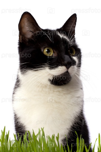 Кошка в траве, изолированная на белом фоне