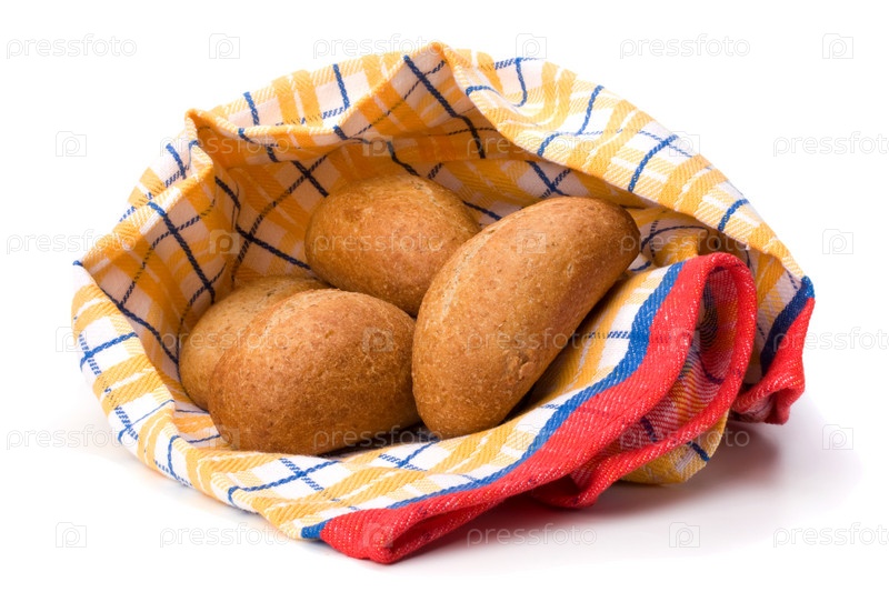 Свежие теплые булдочки в кухонном полотенце, изолированные на белом фоне