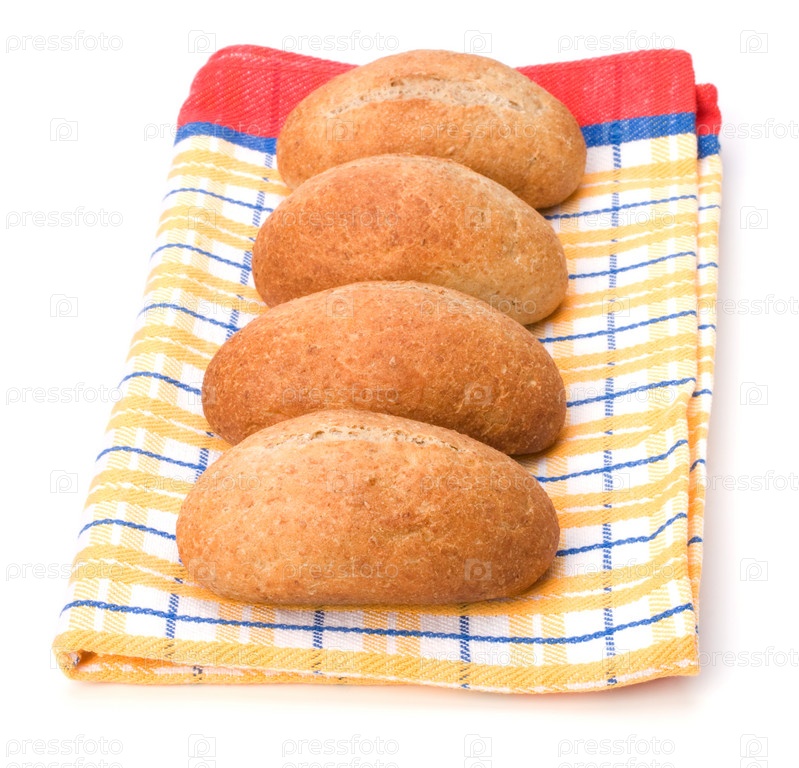 Свежие теплые булдочки в кухонном полотенце, изолированные на белом фоне
