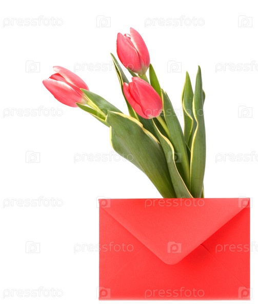 Открытка с розовыми тюльпанами, изолированная на белом фоне