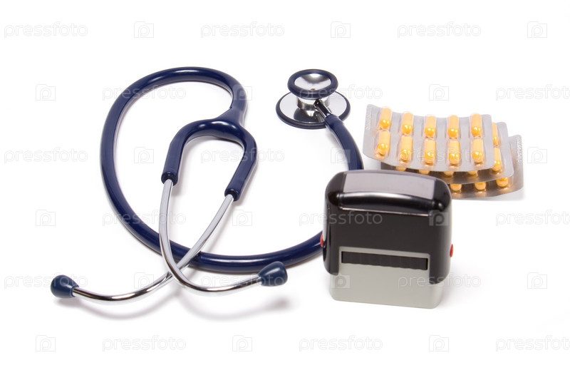 Стетоскоп, таблетки и печать, изолированные на белом фоне