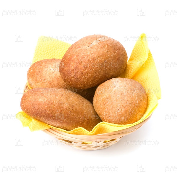 Свежие теплые булочки в хлебнице, изолированные на белом фоне