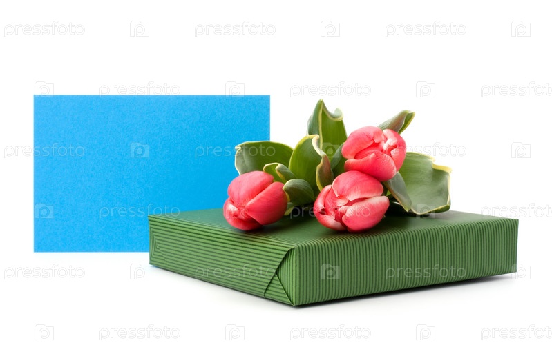 Подарок с розовыми тюльпанами, изолированные на белом фоне