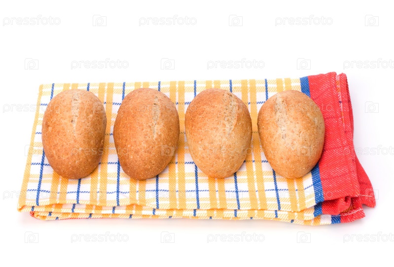 Свежие теплые булдочки в кухонном полотенце, изолированные на белом фоне